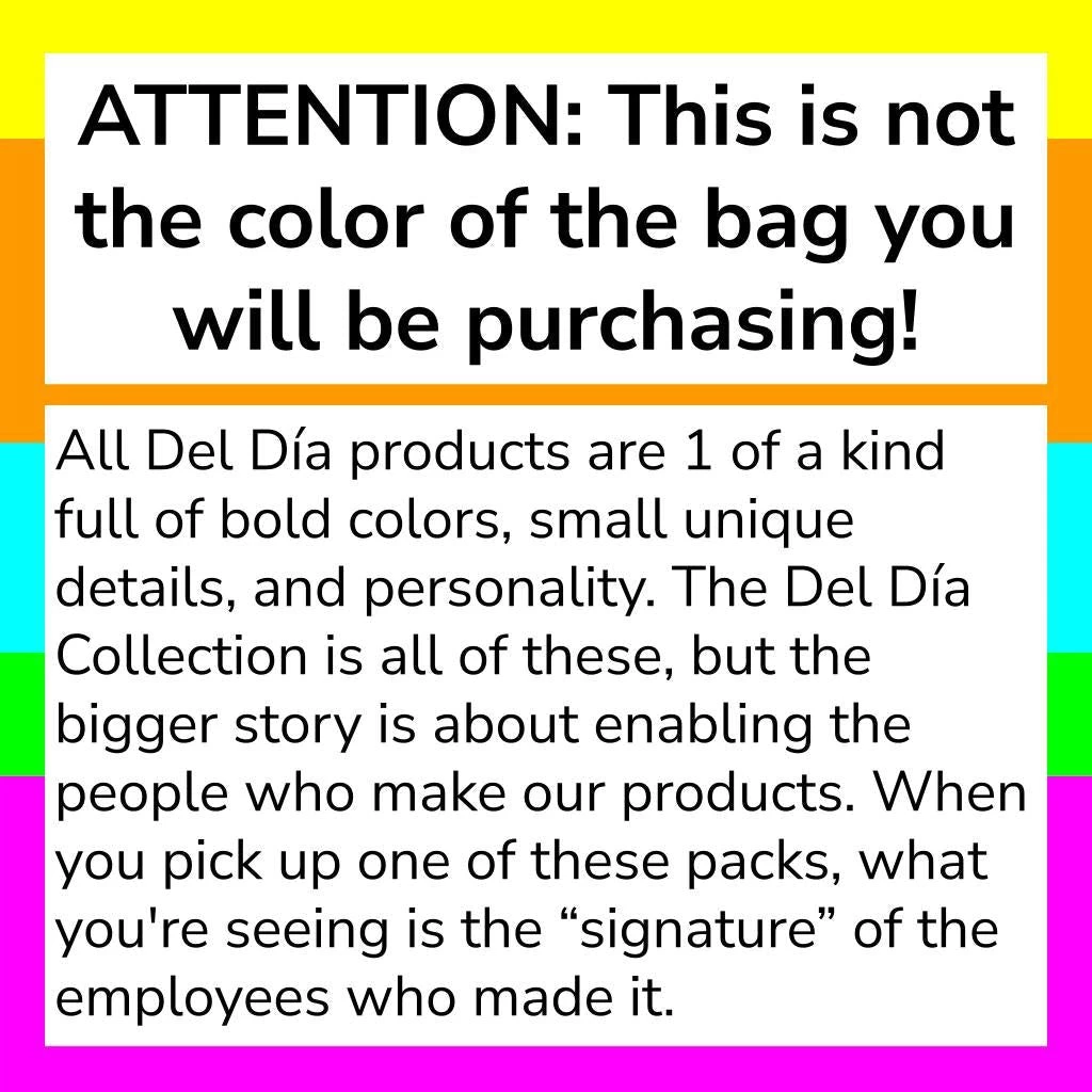 ATTENTION: ALL DEL DIA PACKS ARE UNIQUE IN THEIR COLOR. ALL PRODUCT IMAGES ARE TO SHOW FUNCTION. THE ACTUAL COLOR WILL VARY.