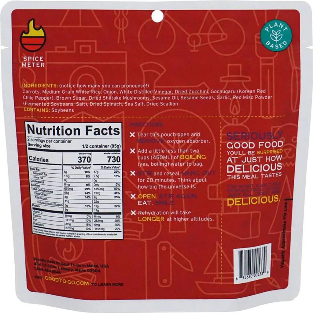 Carrots, Medium Grain White Rice, Onions, White Distilled Vinegar, Dried Zucchini, Gochugaru (Korean Red Chili Pepper), Brown Sugar, Dried Shiitake Mushrooms, Sesame Oil, Raw Sesame Seeds, Garlic, Red Miso Powder (Fermented Soybeans, Salt), Dried Spinach, Sea Salt, Dried Scallion. Contains: Soybeans.