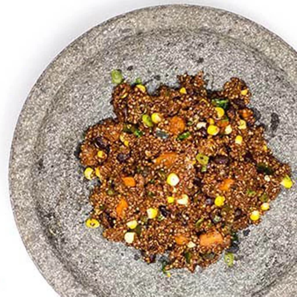 Quinoa, Dried Black Beans, Winter Squash, Corn, Onion, Dried Butternut Squash, Dried Tomato Flakes, Poblano Pepper, Agave, Grapeseed Oil, Garlic, Cacao Powder, Sesame Seeds, Sea Salt, Cumin, Cinnamon, Ancho Chili Powder, Coriander, Fennel Seed, Dried Scallion, Dried Cilantro, Mexican Oregano.