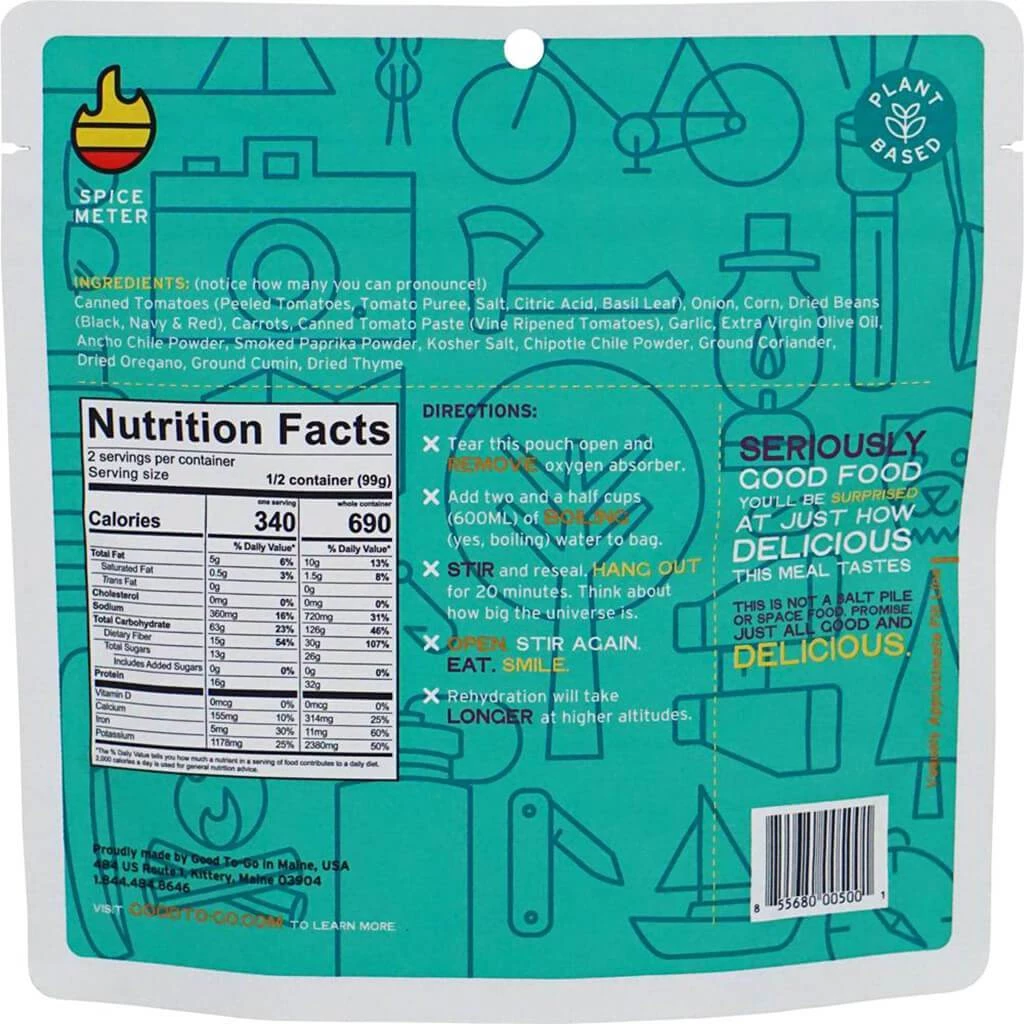 Canned Tomato, Onion, Corn, Dried Beans, Carrot, Tomato Paste, Garlic, Extra Virgin Olive Oil, Ancho Chili Powder, Smoked Paprika Powder, Kosher Salt, Chipotle Chili Powder, Ground Coriander, Dried Oregano, Ground Cumin, Dried Thyme