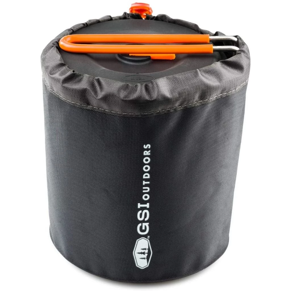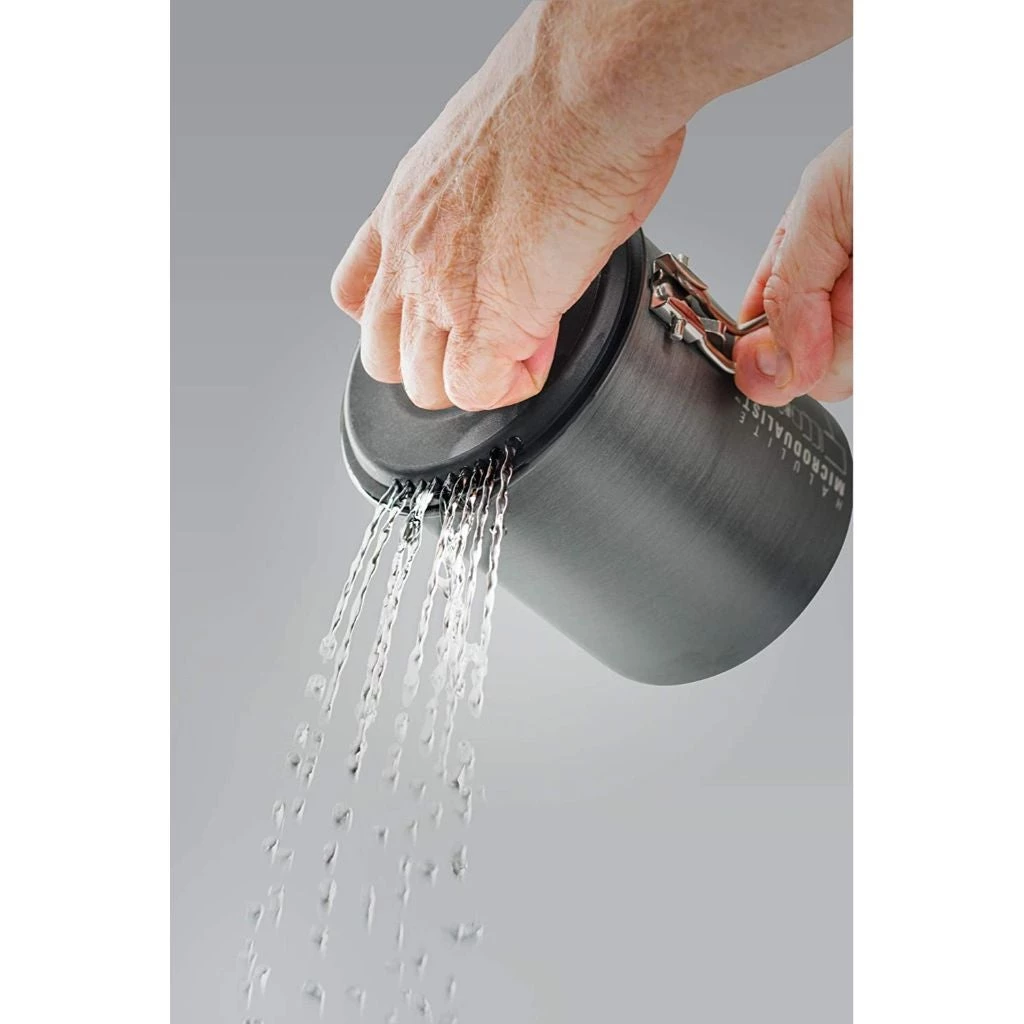 Halulite Microdualist II Cookset integrates everything you need for cooking and eating when backpacking to the extreme. Efficient and ultra-light hard-anodized camping cookware set integrates secure, heat-resistant Nylon 6-6 strainer lid, two Folding Foons, two insulated mugs with sip-it tops and nesting bowls, and a hard anodized 1.5 qt (1.4 liter) pot with stamped in graduations making it easy to measure. Waterproof storage bag also serves as sink in one compact, nested package with room to store a Pinnacle Canister Stove and 110 g fuel canister.