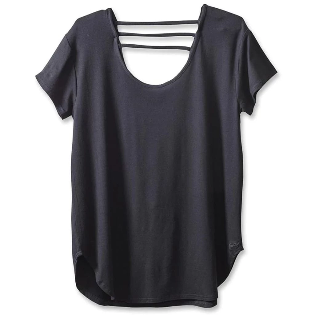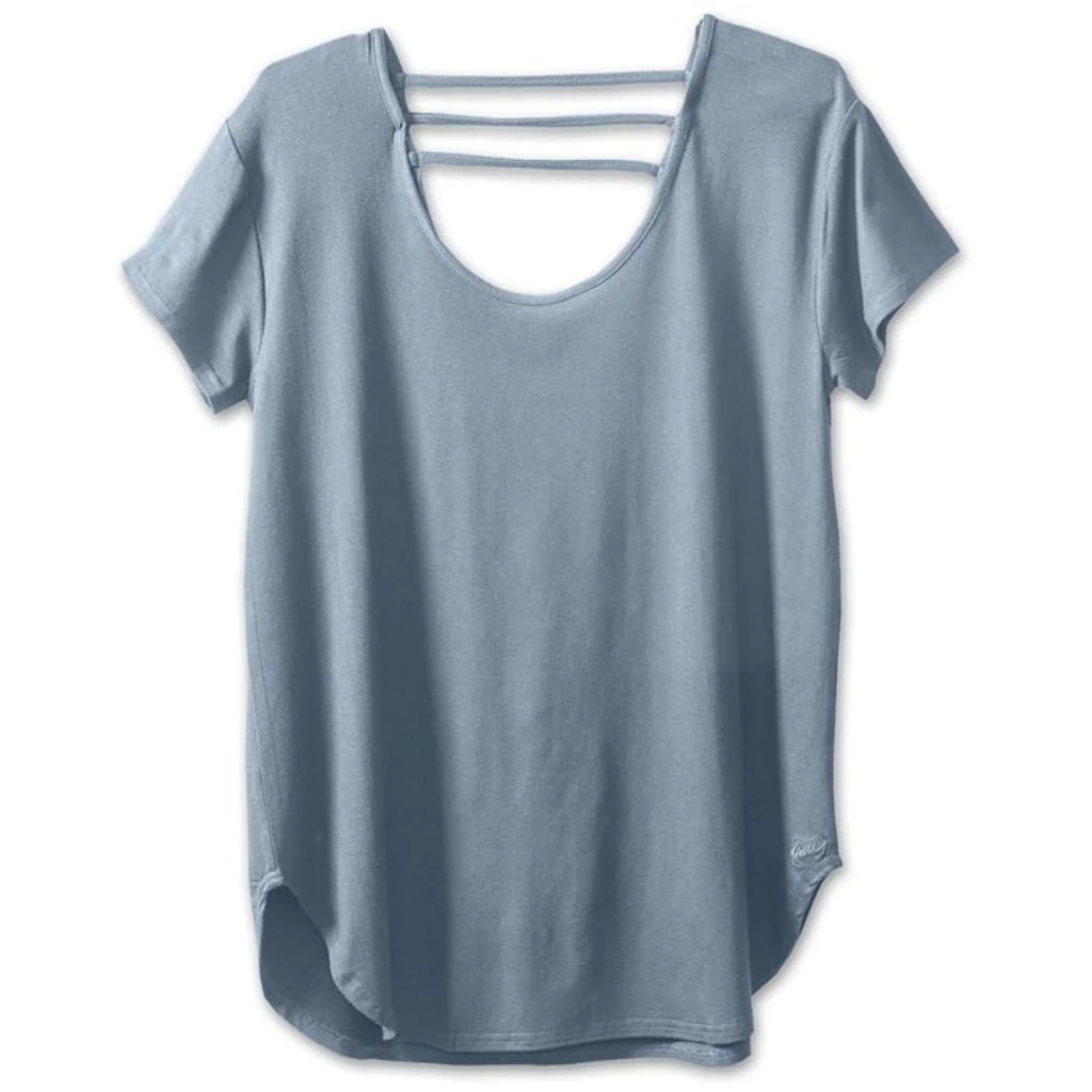 Free flow’n short sleeve t-shirt, scoop neckline, stylized back strap detail, curved hem