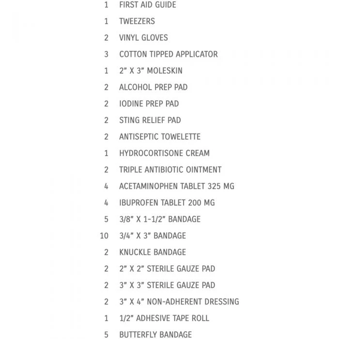 These well stocked first aid kits contain supplies to treat injuries while hiking, camping or backpacking. Contains enough supplies to treat 3 people on a 1 day trip.
