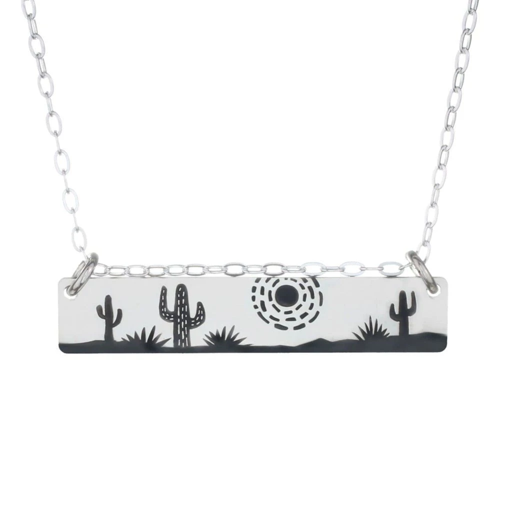 A sterling silver necklace displaying a desert landscape under a sunny sky. Delicate and dainty sterling silver pendant hung from a sterling silver chain.