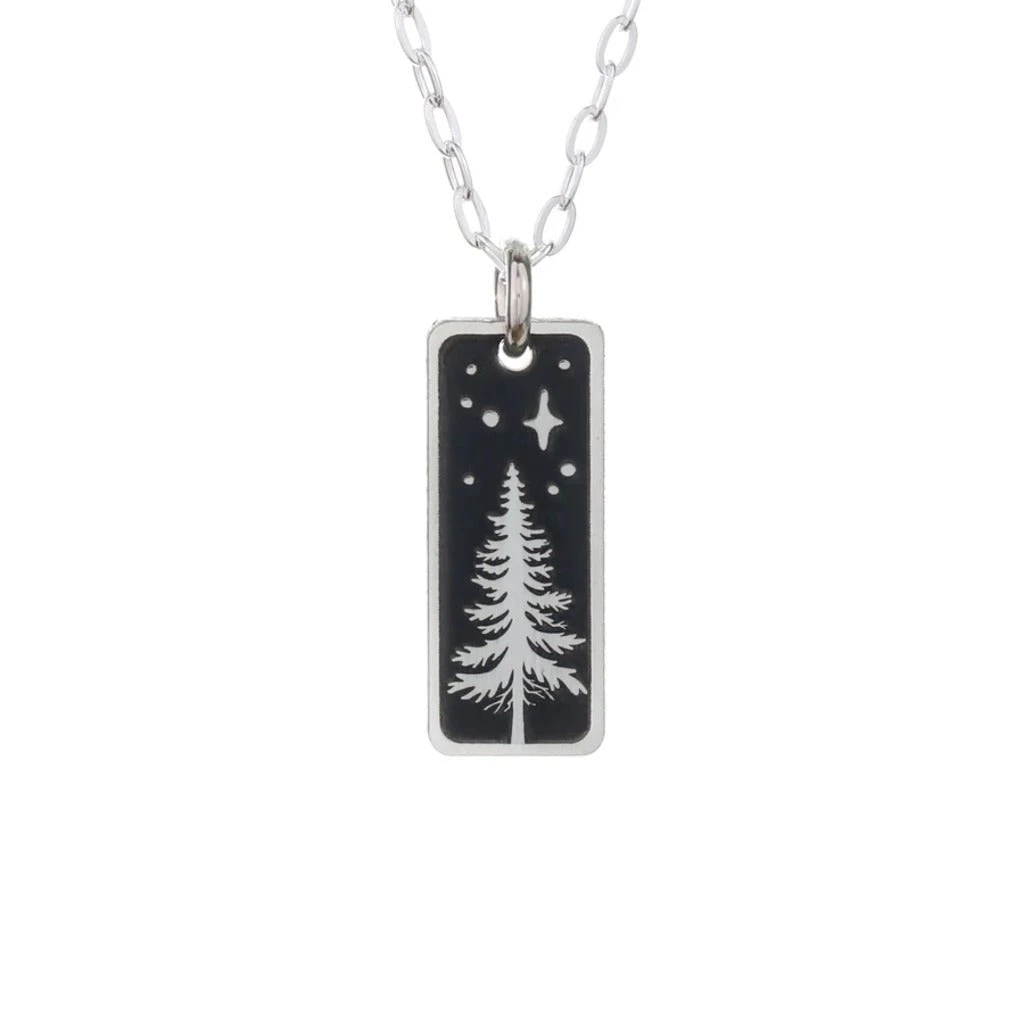 A sterling silver necklace displaying a solitaire spruce tree under a night sky. Delicate and dainty sterling silver pendant hung from a sterling silver chain.
